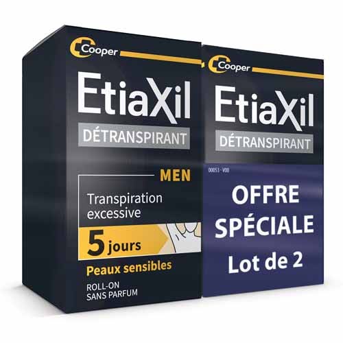 ETIAXILMen De-transpirantUnderarm Roll-on Excessive Sweating TreatmentSensitive SkinPerfumes free2x15mlEtiaxil's Excessive Sweating Detranspirant for Men is essential in the event of excessive underarm perspiration. It neutralises unpleasant odours and blocks perspiration.
