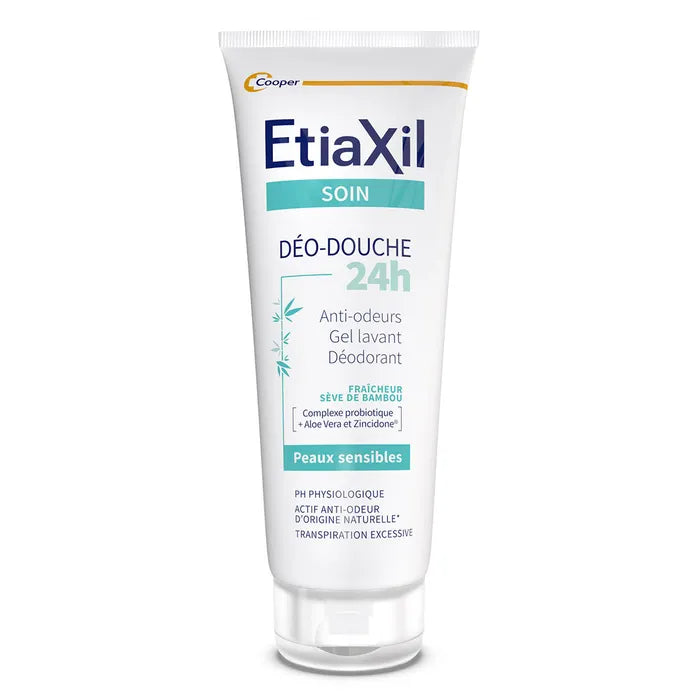 ETIAXIL DEO-DOUCHE: 2-in-1 cleansing and deodorant action. Etiaxil Deo-Shower 24 h combines the effects of a cleansing gel with those of a deodorant, helping - in addition to your usual anti-perspirant - to combat perspiration. The gel cleanser gently cleanses the skin, while the deodorant neutralises perspiration. Etiaxil Déo-Shower 24h leaves a fresh Perfumes of Strawberry on the Skin.
