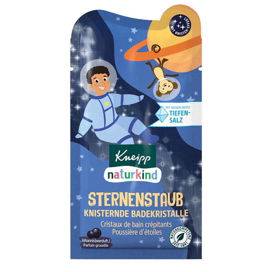 KNEIPP Sparkling Bath Salt With redcurrantsStarFrom 3 years60gSet off on an exploration of space with Kneipp® naturkind Stardust Sparkling Bath Crystals. With a wave of your magic wand, cosmic stardust colours the water blue. The bath, with its fruity redcurrant Perfumes, feels great on your skin and makes you dream of adventures in the starry sky. Can you hear the soft crackle of stardust in the water?