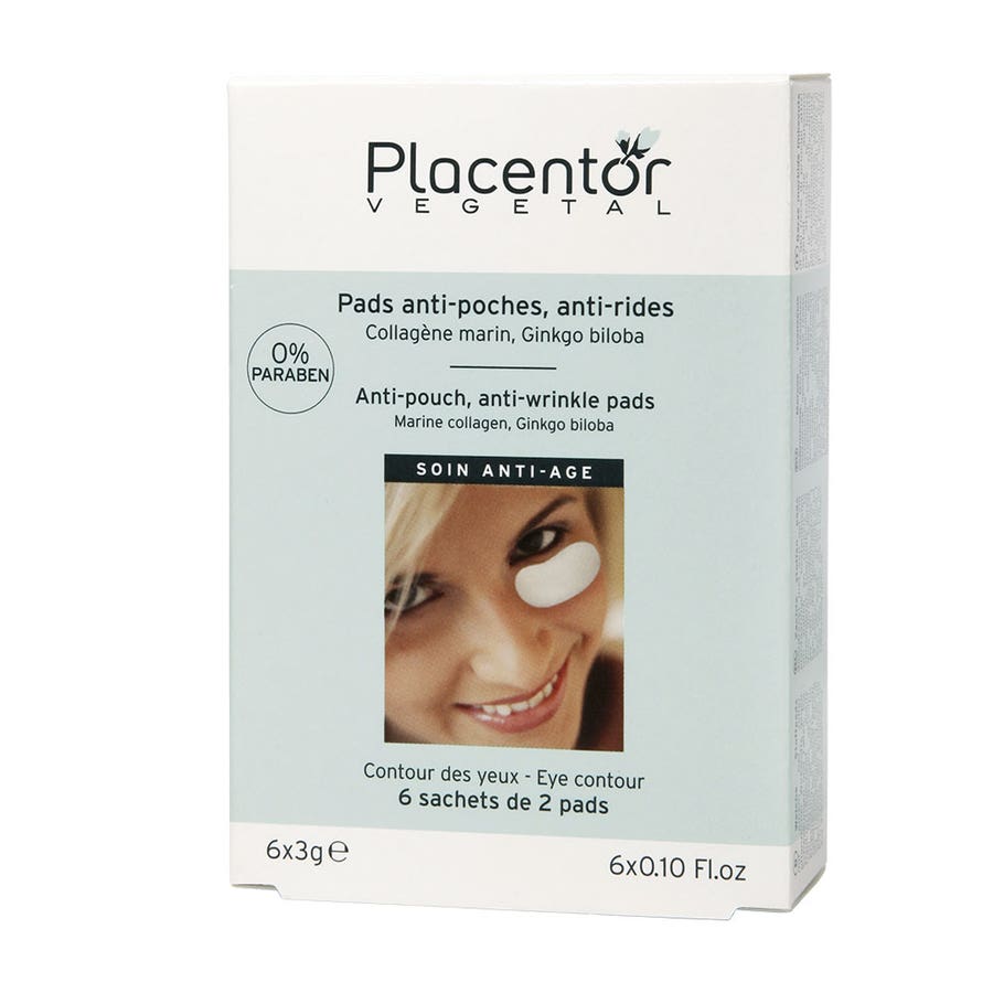PLACENTORVegetal padsPatches packaged by 2 Box of 12 pads (2 x 6 packs) Care with marine collagen acting on water retention, micro-circulation and formation of wrinkles. Ready-to-use treatment pads for the eyes, soaked in a gel filled with active ingredients with anti-wrinkle and anti-puff properties (beech, ginkgo, periwinkle, elderberry, horse chestnut, licorice, collagen). Results: Wrinkles and fine lines fade significantly. Puffiness and swelling visibly diminish. The eye contour is smoothed and rested. Texture of the patch: wet support (self-adhering gel).