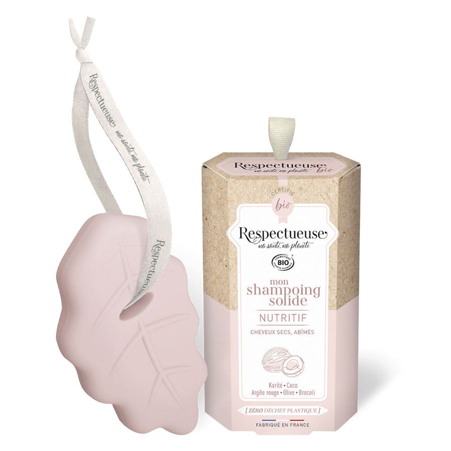 RESPECTOUSSolide ShampooNourishingOrganic CosmeticsDry and damaged hairNatural Perfumes Karité75g Certified organic and eco-responsible, this nourishing shampoo with a natural Perfumes of Karité cares for your dry hair and the planet. Its formula, rich in plant oils and butters (Karité, Coco, Olive, Broccoli), deeply nourishes and repairs the hair fibre. With a generous lather, it cleanses pleasantly and leaves hair clean, soft and silky.