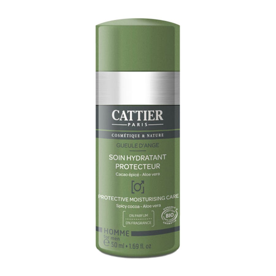 CATTIERMenProtective MoisturizerAngel faceSpicy cocoa and aloe veraOrganic Cosmetics50mlCattier Gueule d'Ange protects, soothes and intensely moisturizes men's skin.Enriched with spicy cocoa, a powerful energising and protective active ingredient, and organic aloe vera, known for its anti-inflammatory and moisturising properties. Organic argan oil, full of vitamin E, and organic shea butter, with their nourishing and repairing properties, regenerates, revitalises and protects from external aggressions.